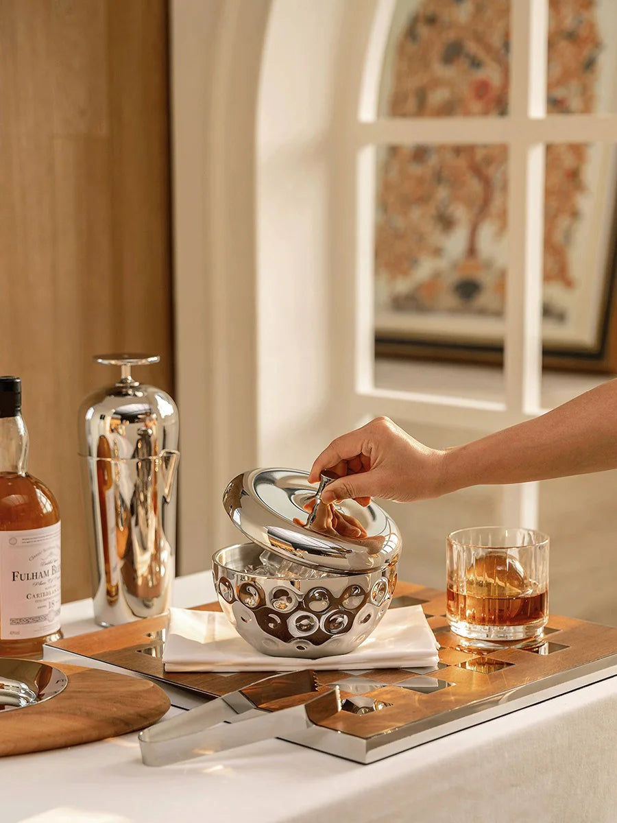 The AVA stainless steel ice bucket is part of the Collection MIRRA from Mary Home Store – a line that celebrates the shine of metal, clean shapes, and the quiet beauty of modern design.