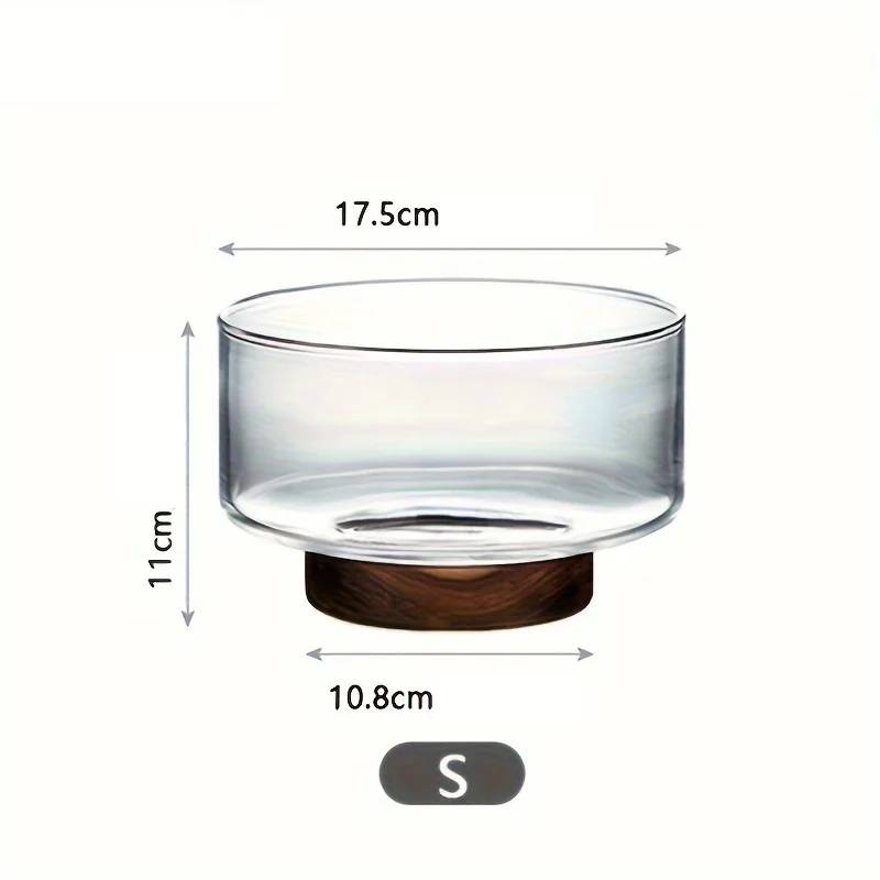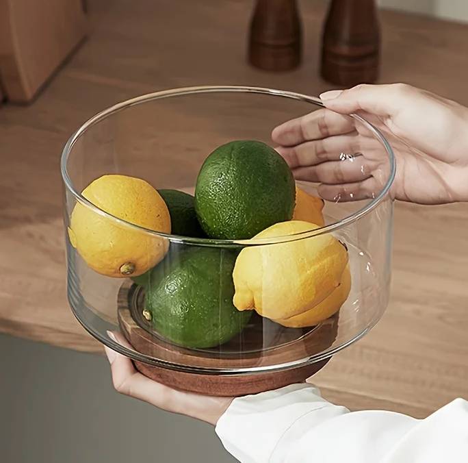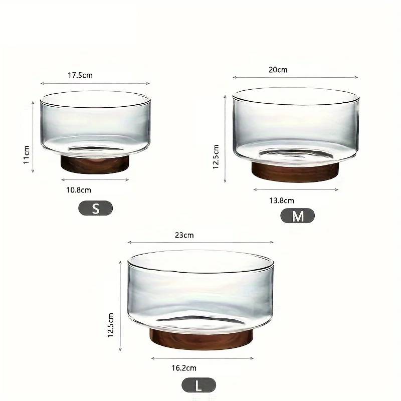 La ciotola di design in vetro con base in legno unisce il design scandinavo alla funzionalità pratica. Che sia per servire frutta, insalate o come elemento decorativo – dona a ogni ambiente un'eleganza sobria.