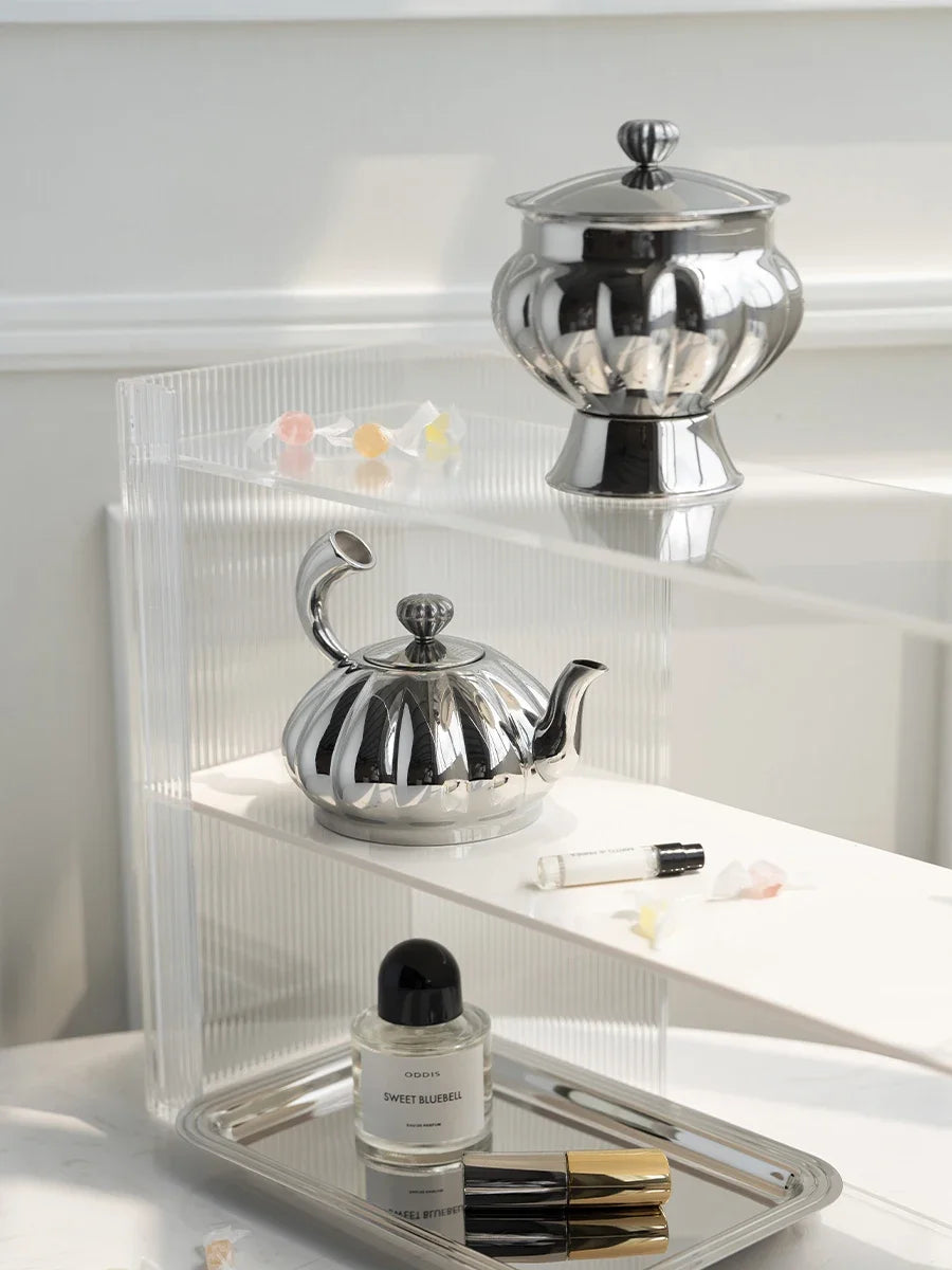 Das Lareen vereint den Charme klassischer Formen mit zeitgemässem Design. Der spiegelpolierte Edelstahl reflektiert das Licht sanft und bringt einen Hauch von zeitloser Raffinesse auf den Tisch. Perfekt für stilvolle Teemomente – allein, mit Gästen oder als elegantes Geschenk.