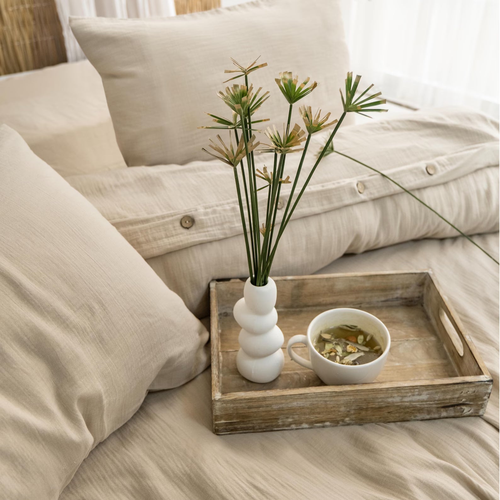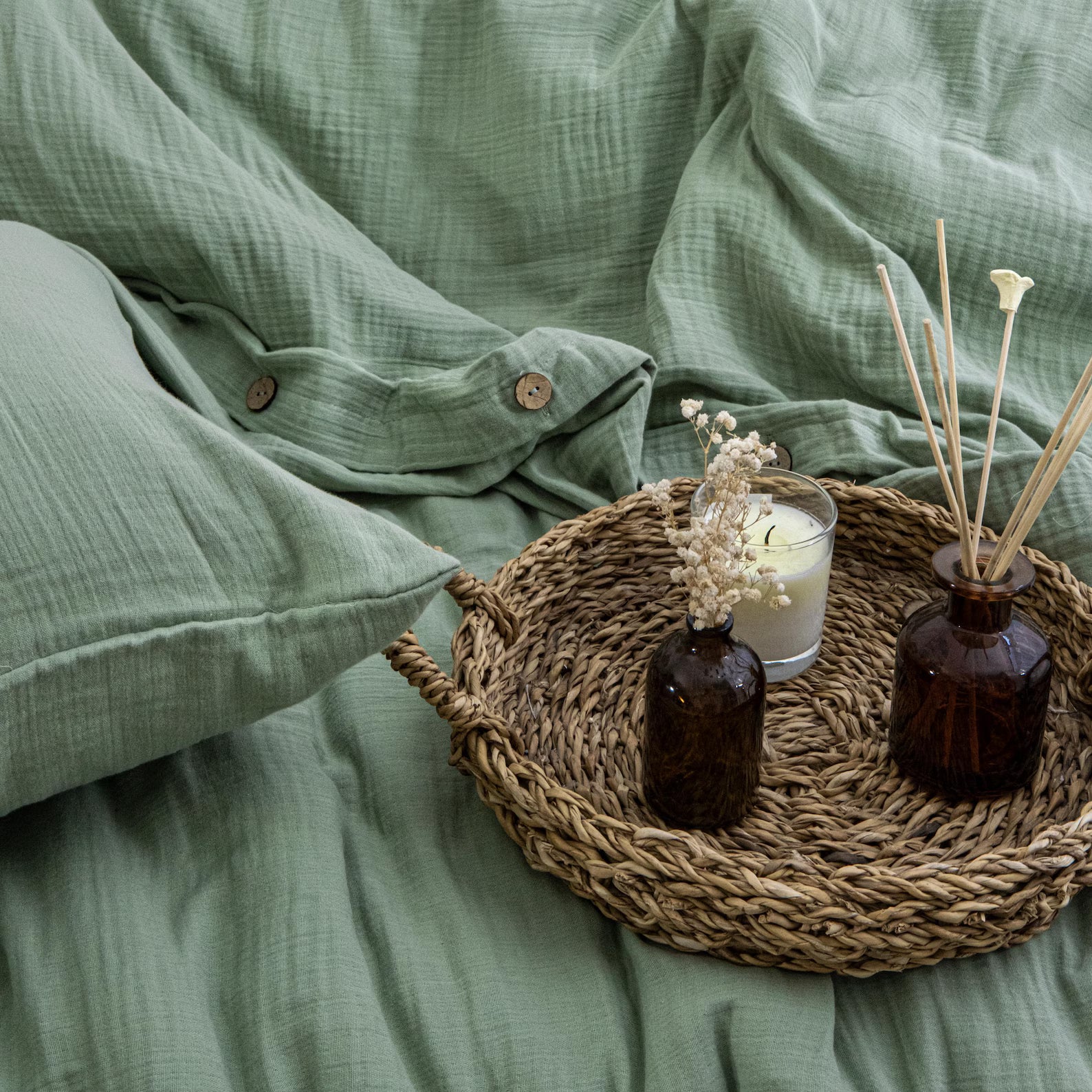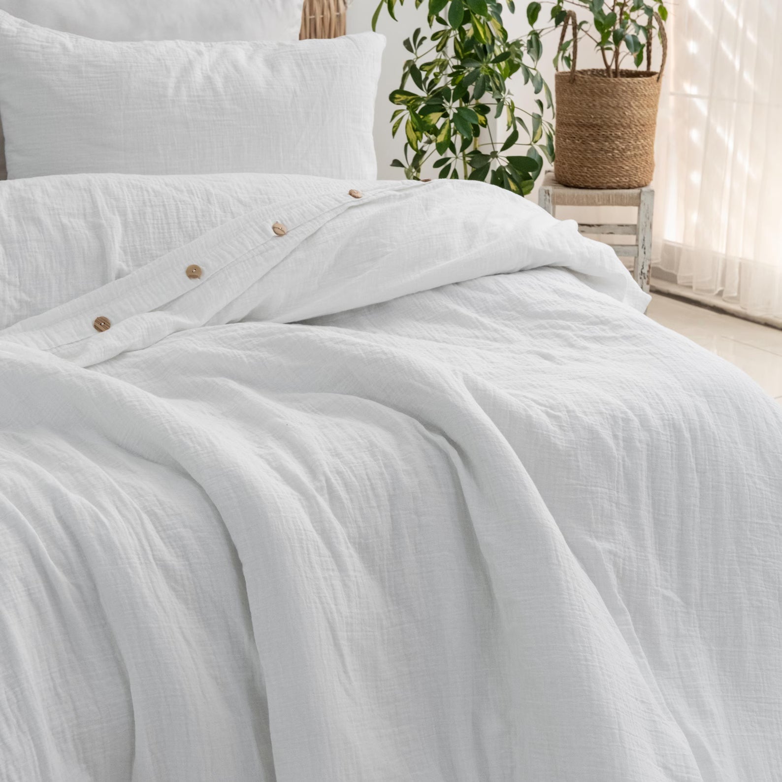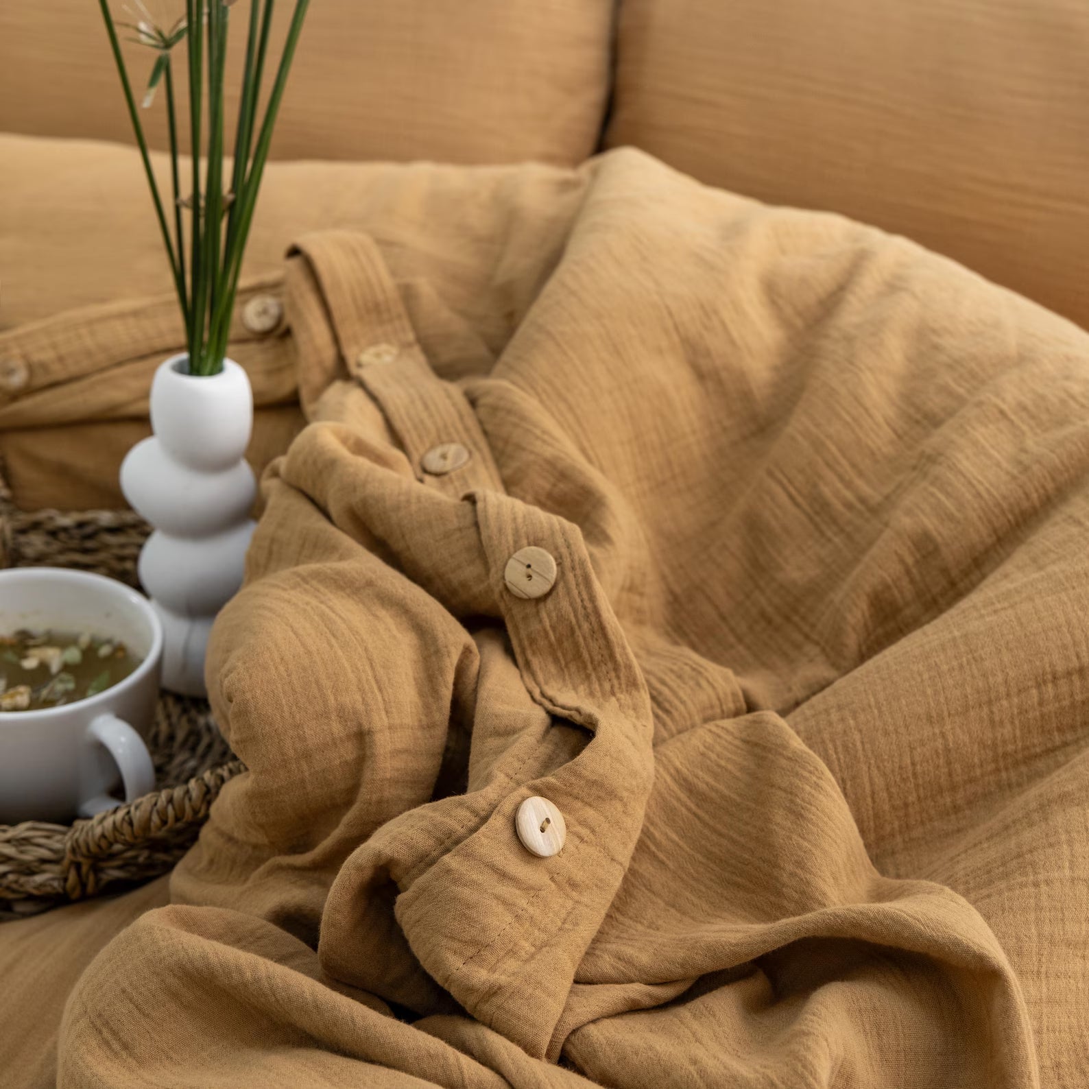 Erleben Sie die aussergewöhnliche Weichheit von Musselin aus türkischer Bio-Baumwolle. Dieses Duvetbezug Set vereint eine luftige, mehrlagige Struktur mit zeitloser Ästhetik und schafft eine ruhige, harmonische Atmosphäre in Ihrem Schlafzimmer.