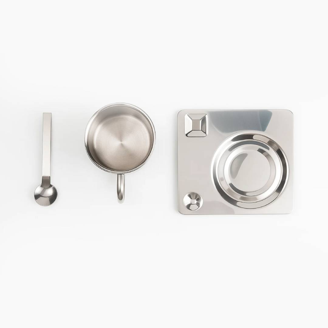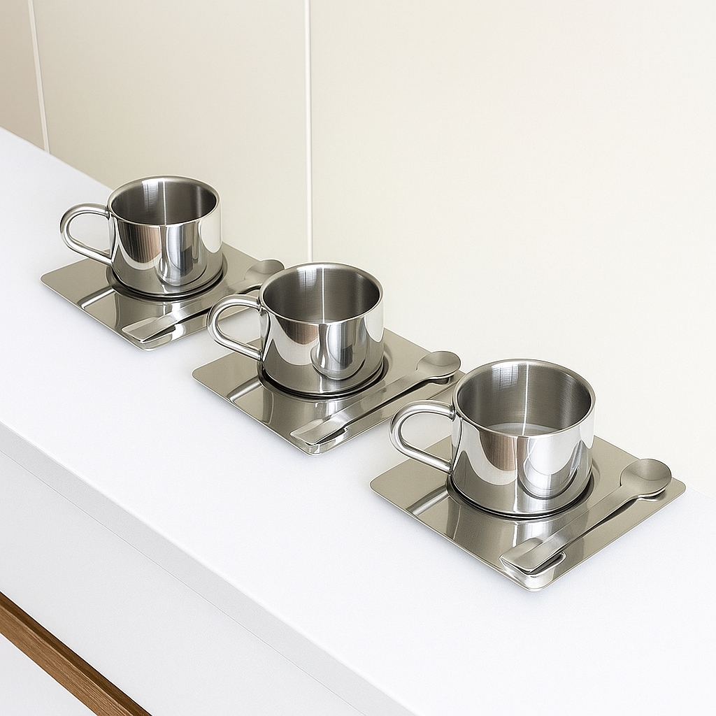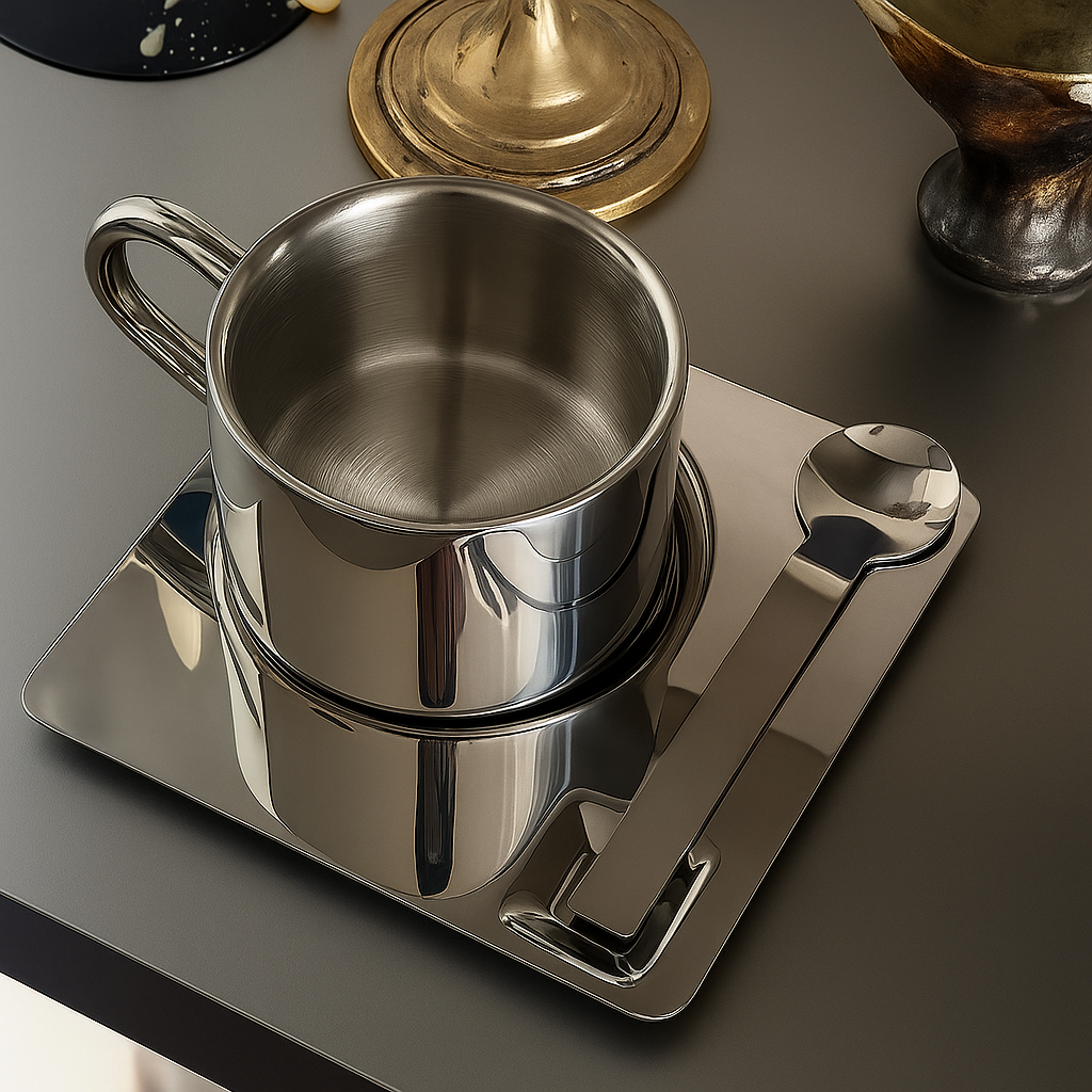 Tasse mit Unterteller und Löffel aus Edelstahl Bryn – Eine Geste minimalistischer Eleganz im Alltag