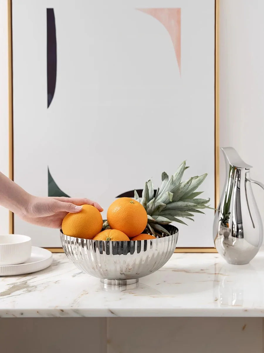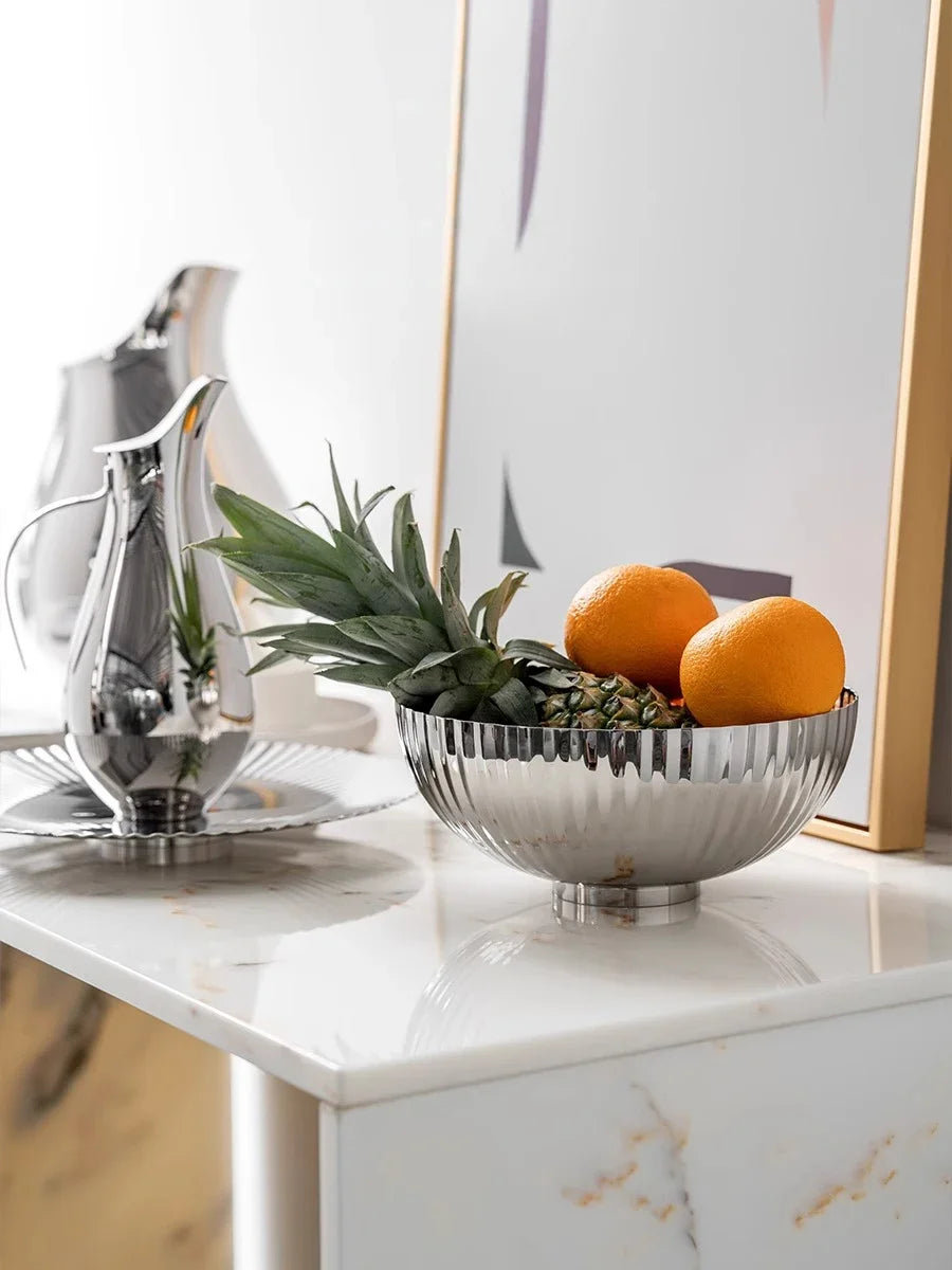 Die Aurea vereint klassische Handwerkskunst mit modernem skandinavischem Design. Ihr charakteristisches, geriffeltes Oberflächenmuster erinnert an edle Metallarbeiten vergangener Epochen, während die handpolierte Spiegeloberfläche Licht und Schatten auf faszinierende Weise einfängt. Ob als Obstschale, Salatschüssel oder dekoratives Zentrum – die Aurea verleiht jedem Raum eine elegante Ausstrahlung.