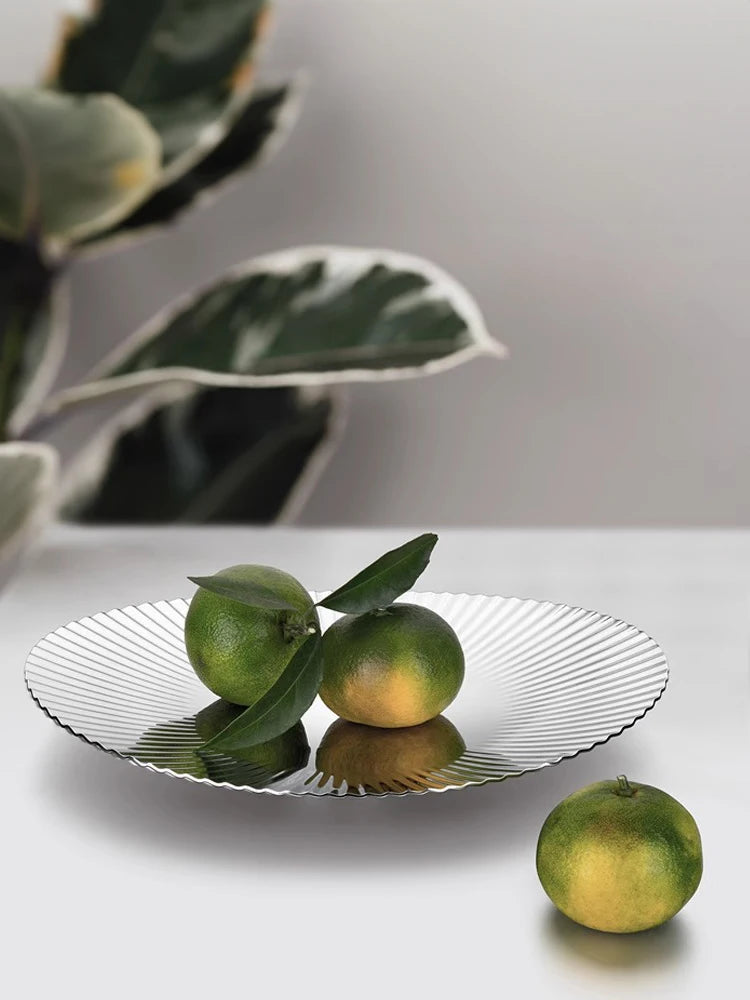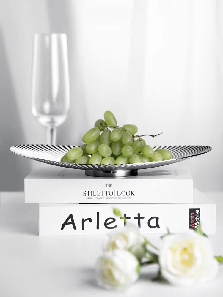 Ihr wellenförmiges Design und die handpolierte Oberfläche aus Edelstahl reflektieren das Licht sanft und schaffen eine ruhige, luxuriöse Atmosphäre – als Dekoschale, Servierschale oder Statement-Stück auf dem Tisch.